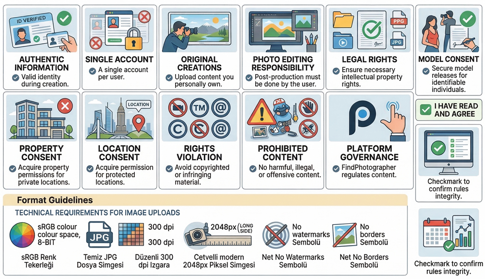 ✪ FindPhotographer reserves the right to review, restrict, flag, hide, or remove any uploaded content that appears to violate platform policies, third-party rights, or legal requirements.